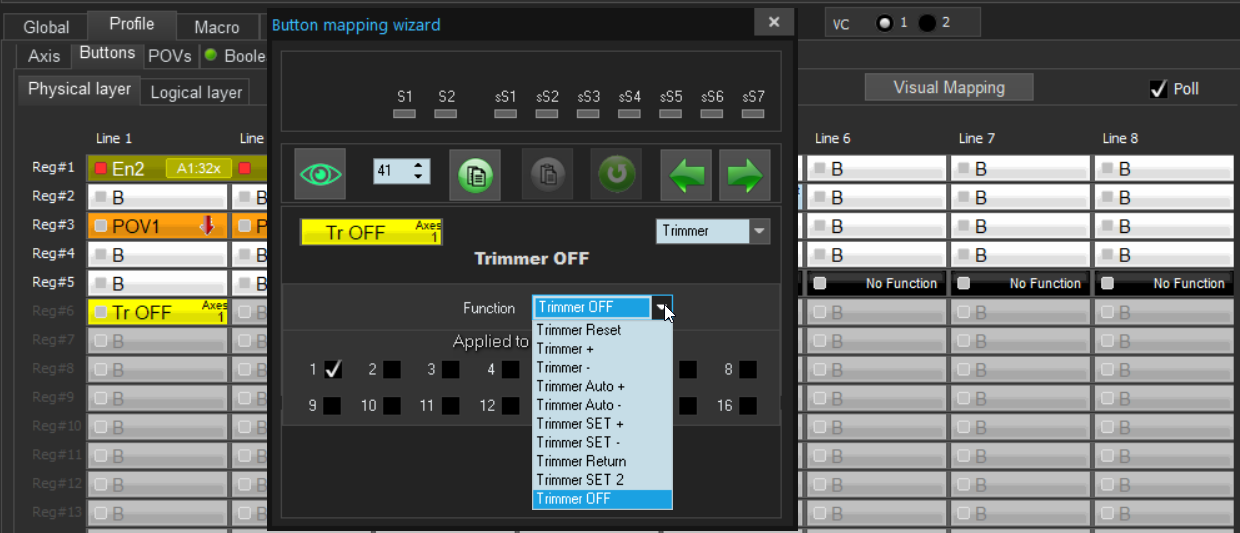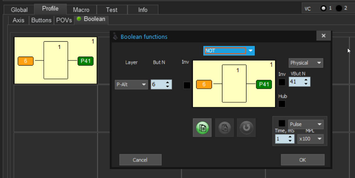 Alex_Oz Опубликовано: 28 июля Опубликовано: 28 июля (изменено) 9 часов назад, Pilli сказал: 1. Есть ли смысл мне использовать автоконфигурацию или достаточно сбросить в дефолт и откалибровать? 2. Какие параметры изменяет функция автоконфигурация? Гладиатор VKB не имеет функции автоконфигурирования - поэтому просто калибровка. Автоконфигурация для девайсов там где она есть - по факту создает простой профиль, который ранее был в специфицированной прошивке - т.е. затрагиваются внешние девайсы, оси-кнопки и т.п. 6 часов назад, Pilli сказал: Подскажите пожалуйста. Как запрограммировать что бы при нажатии кнопки ось триммера комбинировалась с осью тангажа (Y), и соответственно при повторном нажатии этой же кнопки, ось триммера отвязывалась от оси Y. Суть, сделать возможность периодического подключения второй оси (оси триммера) к управлению по тангажу. Весь день листаю форум и мануал, но конкретно нужной конфигурации не нахожу. До сих пор такой задачи не возникал, поэтому и нет готовых решений. В теории можно было бы использовать простой T-триггер, ему на два оппозитных выхода повесить две функции - TrReset и TrReturn По факту тоже самое делает функция Tr OFF ( добавил в прошивку и конфигуратор): Прошивка на простой Гладиатор: https://1drv.ms/u/c/570450f29ce7df25/EemMIonmX5lKgN99L6jLRH8BqNn397yC06_FGz8ICAUj3Q?e=10NR9D VKBDevCfg-C_v0.93.51 Функции триммера не имеют защелки - только прямое действие от линии. Поэтому булевский повторитель вытаскивает линию с фиксацией ( P-Alt) - хотя также можно было бы использовать -Т-Триггер. Считаеся что сам триммер у вас уже настроен и работает. В примере выше триммер через комбайн- это не то. Нужен триммер физ. оси. https://www.njoy32.vkb-sim.pro/home/input-functions/trimmer https://www.njoy32.vkb-sim.pro/home/axes/trimmers Изменено 28 июля пользователем Alex_Oz 1