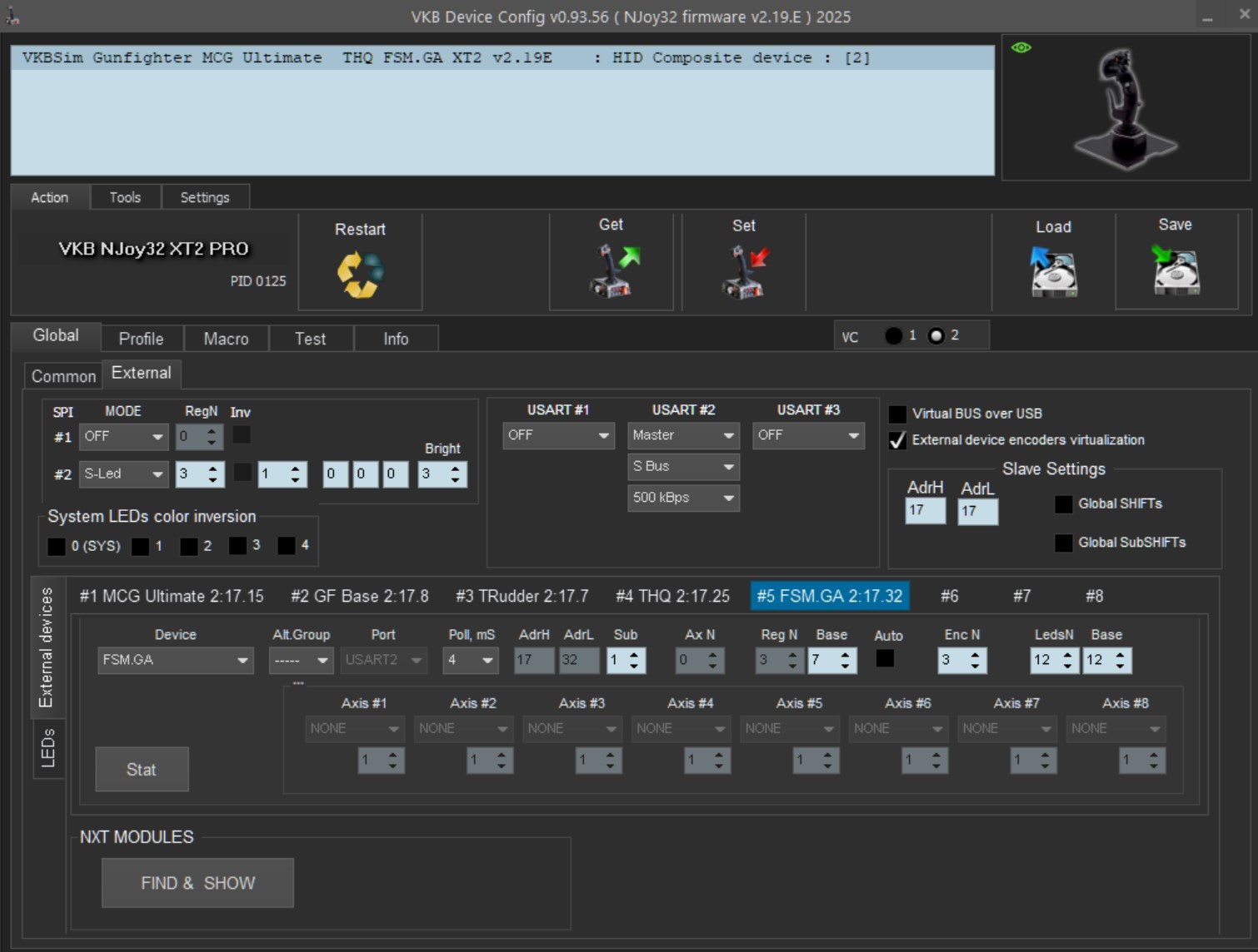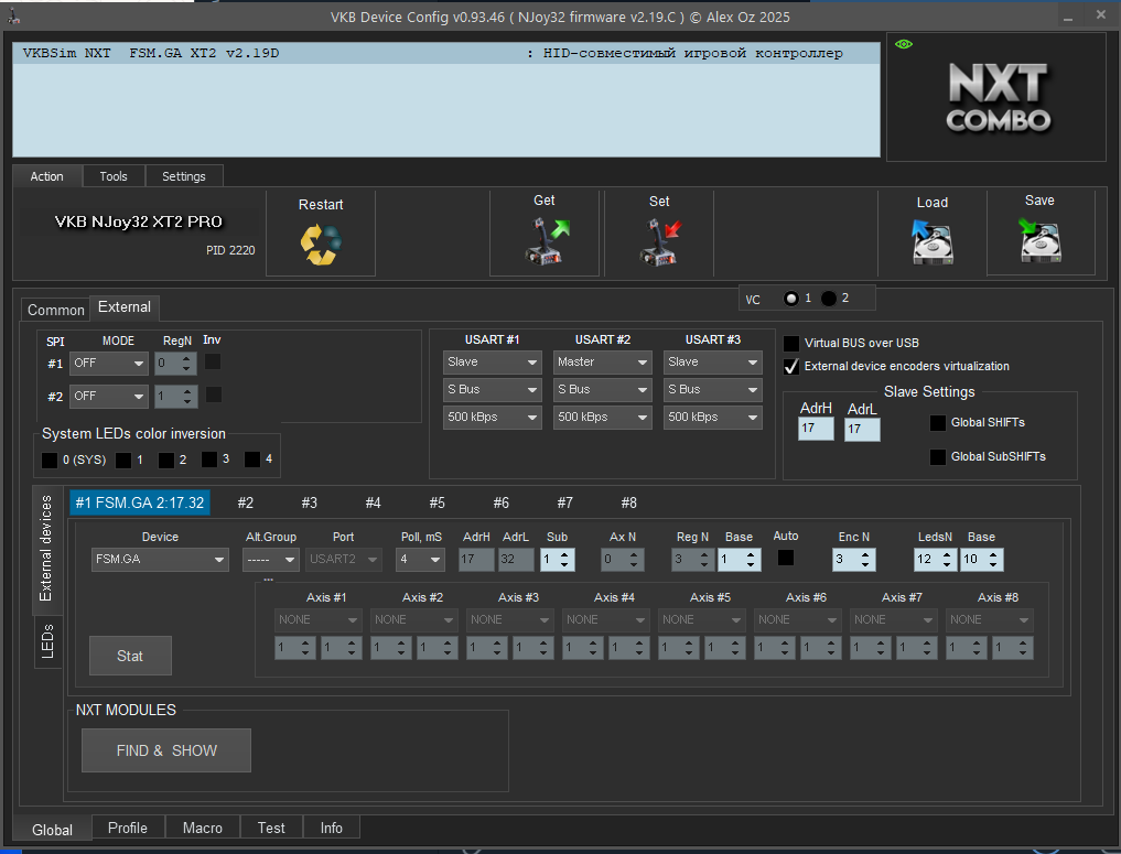 La_GGaR Опубликовано: 3 августа Опубликовано: 3 августа Добрый день. @Alex_Oz - есть ли где то актуальная инструкция по соединению и настройке устройств используя BUS шину? Интересует актуальная версия. На форуме VKB есть: http://forum.vkb-sim.pro/viewtopic.php?f=15&t=2050. Но это было до новых устройств, с разъемом подключения TypeC, в которых куча разных разъемов, до BlackBox 3 и т.д. Для примера. Есть связка BlackBox2. В них подключены педали Trudder4. Через 4хпроводной кабель это соединяется с BlackBox3. В который в свою очередь воткнут GF4 с ручкой MCG ultimate. И все общение, что в ручке, что между BlackBox-ами ведется через USART2. Если что, руками я конструкцию настроить самостоятельно не смог, брал готовые прошивки. Затем беру FSM-GA и пытаюсь подключить к этой конструкции. Есть варианты - подключаться через TypeC или через разъемы в самом устройстве. Для простоты эксперимента беру TypeC. Сделал кабель с TypeC на Gx7. Подключаю к разъему этот кабель в BlackBox2. Какими то танцами с бубном получаю, что на BlackBox2 устройство видно. Но только в случае, если в FSM-GA вытаскиваю контроллер GNX USB контроллер и оставляю заглушку для TypeC. Но дальше, какими танцами с бубном я не танцевал, на BlackBox3 ничего получить не смог. Если же в FSM-GA оставить контроллер, то заставить видеть что либо на BlackBox2 так и не вышло. И это еще не рассматриваю варианты, что внутри есть разъемы подключения напрямую к плате, через jst разъем. Хотелось бы разобраться самому, и самому потом настраивать все, чтобы по каждому чиху не лезть на форум и не просить настроить. Но сейчас, т.к. свежих каких то мануалов нет, приходится тыкаться с околонулевым выхлопом. Пробовать разные варианты. И догадываться - толи это я криво настроил, толи неправильно прочитал, толи (чего уж греха таить - бывает) ошибки в софте. И даже если каким то образом заработало (аллилуйя!!!) через год приходится самостоятельно все заново вспоминать настраивать. с беготней по тем же граблям. PS: для примера, начинаю настраивать FSM-GA, как дано по инструкции с форума VKB и включить должен режим ведомого. Делаю так: Какой порт должен быть ведомым? Если я делаю ведомым 2 порт - то FSM GA перестает работать. На 1 и 3 портах в дальнейшем BlackBox2 не видит и не находит FSMGA.